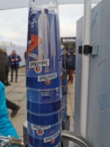 The Olympiastadion has an additional perimeter which is where you show your tickets, you can just about see that in the video above. Once inside the gates it is very open and this is where you will find souvenir kiosks and stalls selling various food and draught beer. There are some large beer marquee’s but also some pop-up mobile kiosks which are very similar to a set-up you would see an RAC sales person have at a motorway services. These are quick and efficient queues. The beer cups are good quality with a series to be collected which we rated as an 8/10 using our beer cup score card.