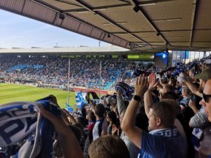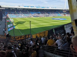At half-time the score was 0-0 and we used this time to leave the stand and walk round to the Bochum end where we let in as we showed our next match ticket.  Being late to arrive we had a short queue for a Pretzel and whilst still digesting this something happened – there had been a goal and we’d missed it.  Dynamo Dresden had come straight out in the second half and took the lead in the 46th minute.  This goal naturally encouraged us and others to get straight back to the stands.  Soon after, in the 63rd minute, Dresden doubled their lead with a goal from Kone.  Clearly we had opted for the wrong end to be in during the second half – or maybe not….