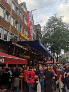 Zum Schlussel is one of six pubs in Dusseldorf which brew on site and they will serve small 0.25l measures of beer yet do not despair, before your glass is empty another will be placed in-front of you. A tally is kept with pencil marks added to your beermat – just place this mat on your glass to stop more arriving and to pay your bill. They also serve take-away bottled beers should you want to lubricate your lungs on the train to the ground. The beer served is the famous Dusseldorf Altbier, a coppery style beer unique to the region, it’s what everyone drinks as opposed to Pils.
