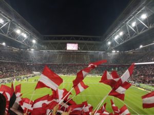 Whilst the Fortuna Dusseldorf Stadium is one of the largest stadiums in Germany, currently the 8th largest capacity with 54,600, it also boasts a massive support. That, tied in with the clubs promotion just two years ago back to The Bundesliga , the ground was one of the best atmosphere’s that we have experienced in Germany. A variety of songs dominated proceedings as you expect with flags flying throughout.
