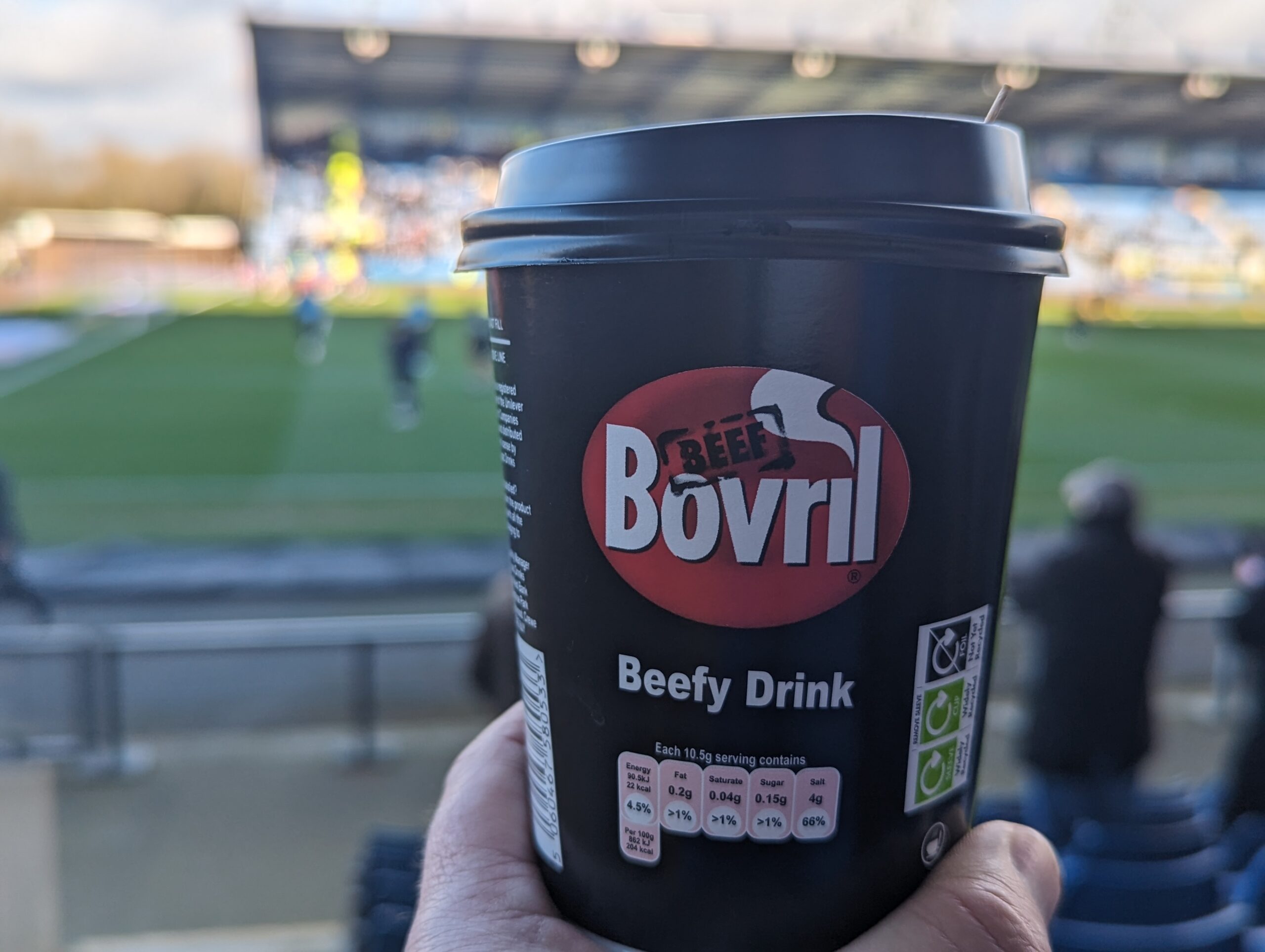 Compared to other stadiums we have visited recently, there were far fewer food options, both outside the ground and inside. We had a nice cheeseburger outside the ground and a Bovril inside.